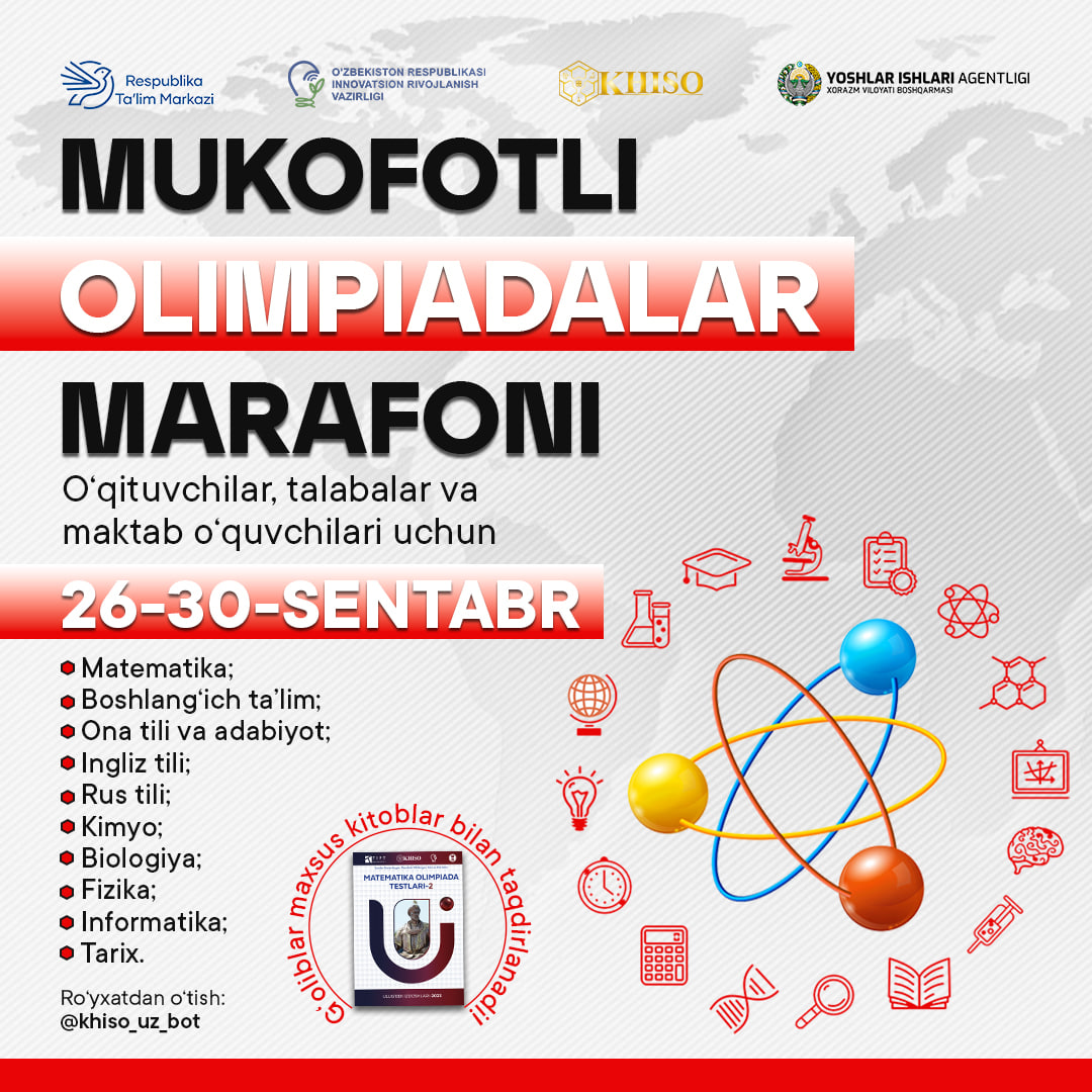 O‘quvchi va o‘qituvchilarning bo‘sh vaqtini mazmunli o‘tkazish, iqtidorli o‘quvchilarni aniqlash hamda g‘oliblarni rag‘batlantirish maqsadida Yoshlar ishlari agentligi, TIFT universiteti hamda KHISO olimpiada maktabi hamkorligida 10 ta fandan 5 kun davomida bepul onlayn olimpiadalar marafonini tashkil etadi.