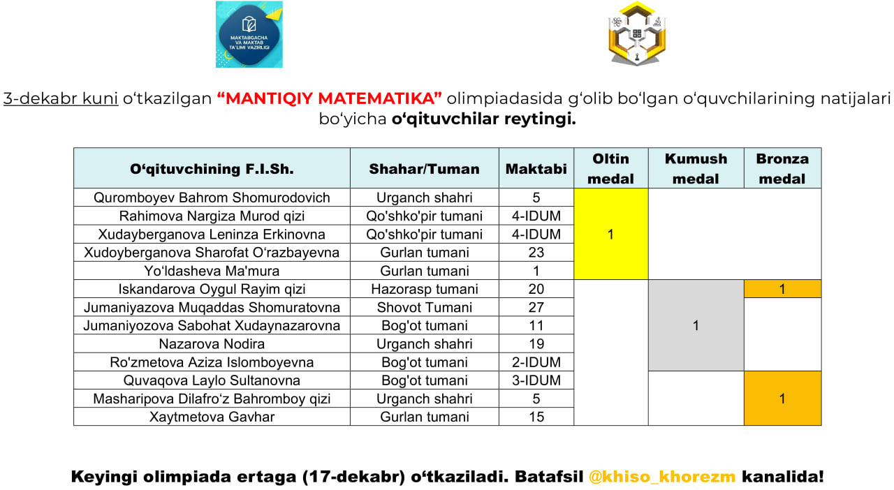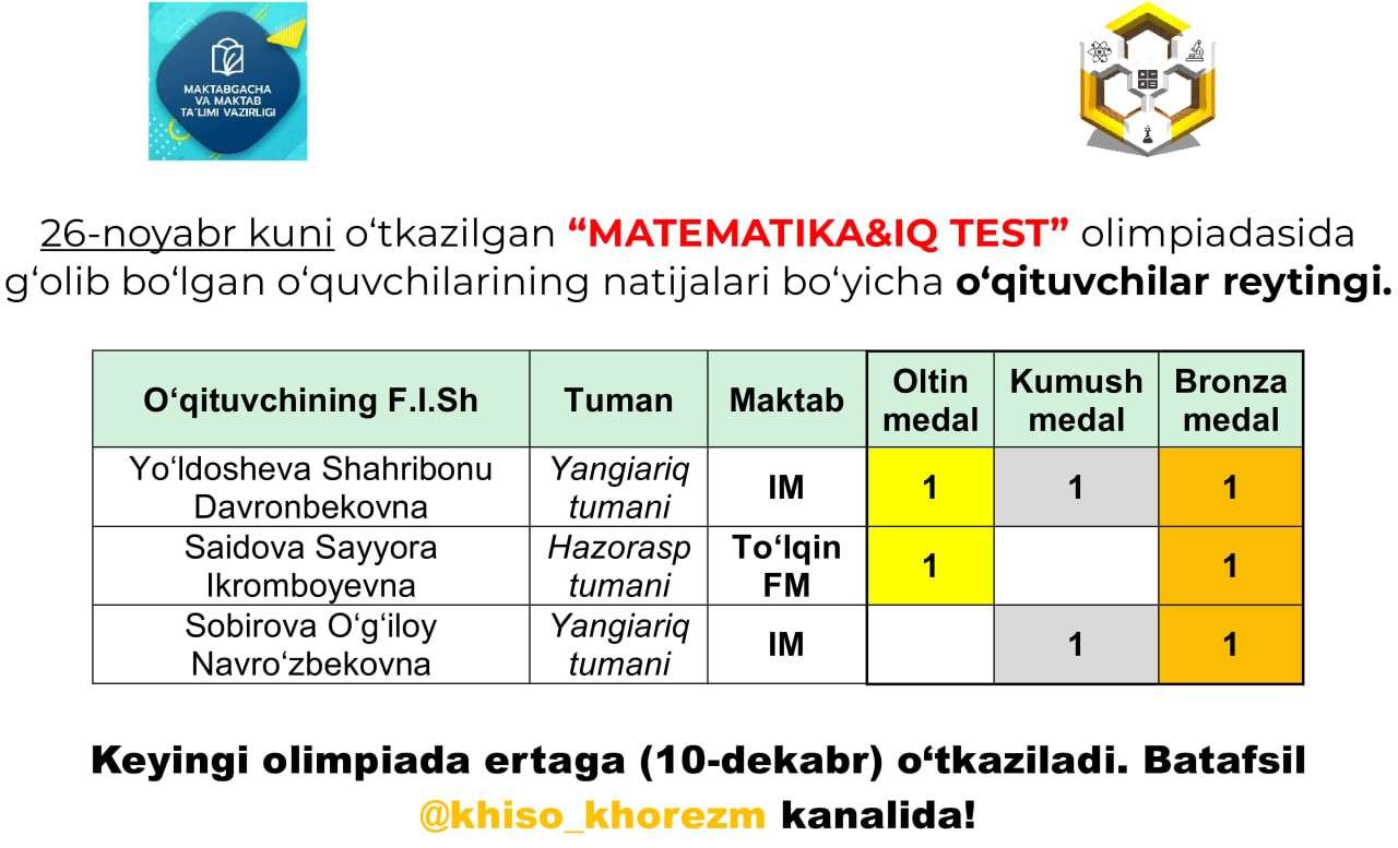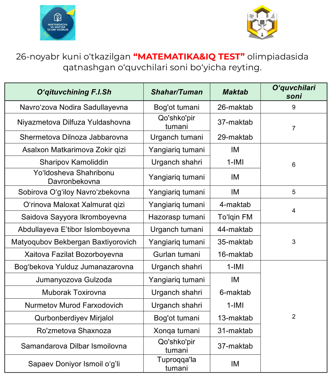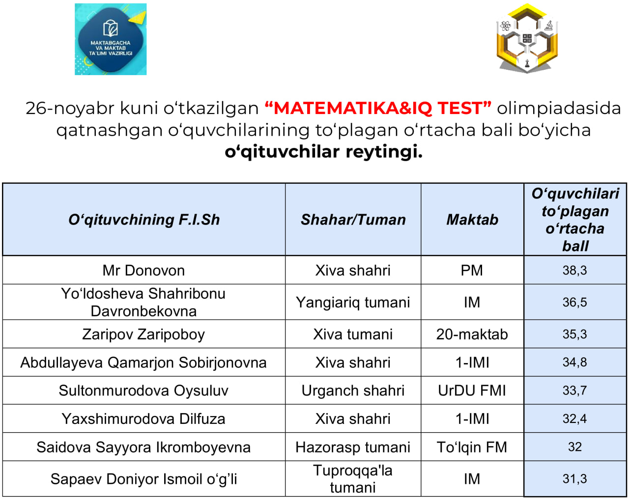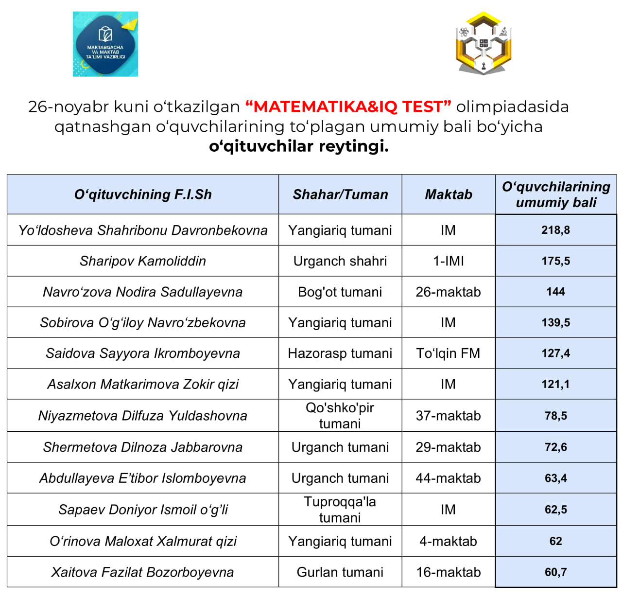 26-noyabr kuni o‘tkazilgan “MATEMATIKA&IQ TEST” olimpiadasida g‘olib bo‘lgan o‘quvchilarining natijalari