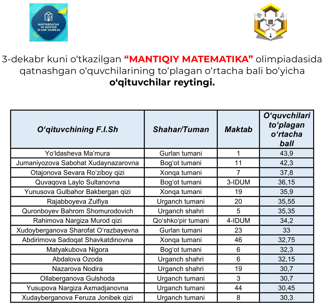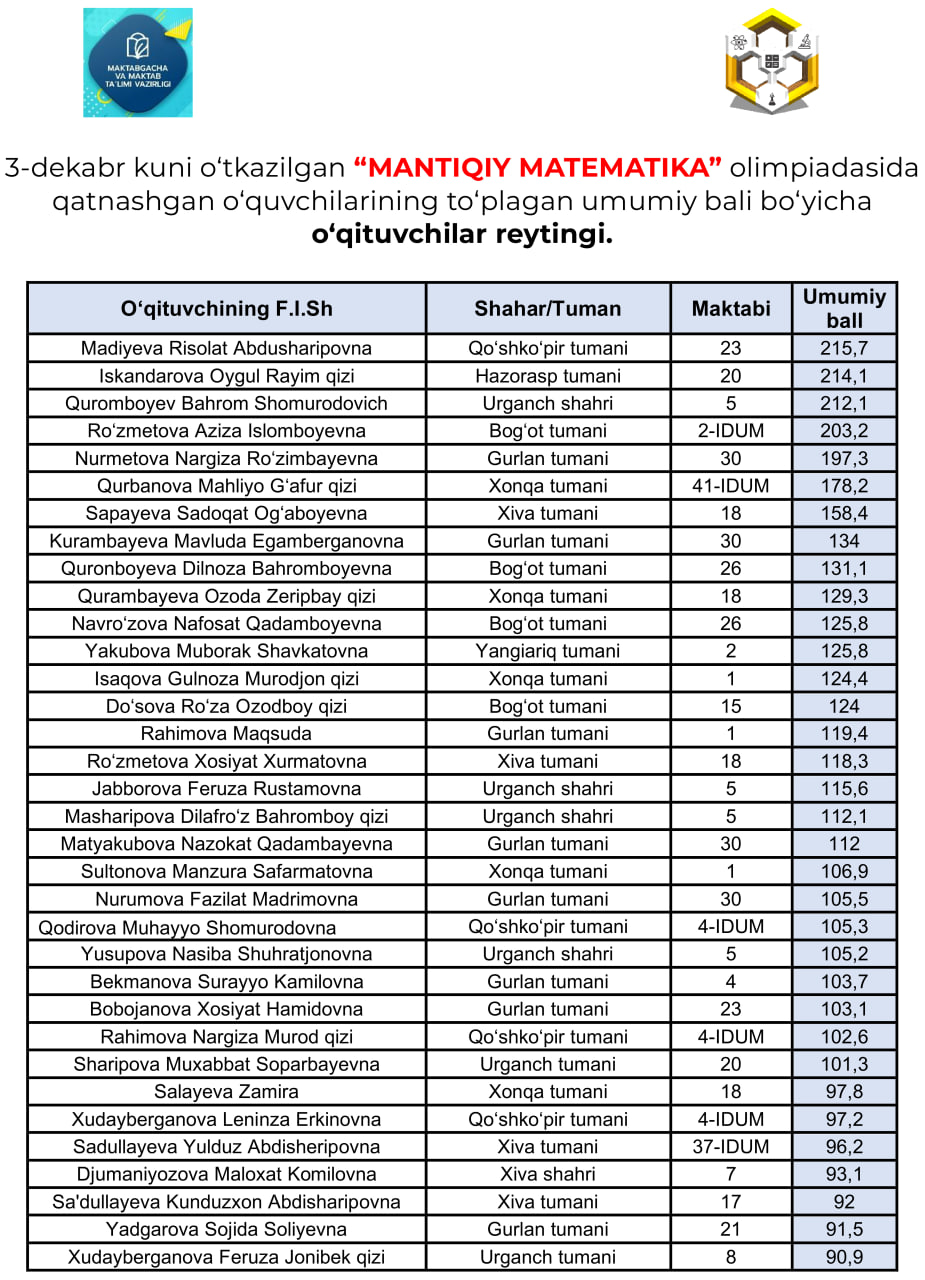 3-dekabr kuni o‘tkazilgan “MANTIQIY MATEMATIKA” olimpiadasida qatnashgan o‘quvchilarining to‘plagan o‘rtacha bali