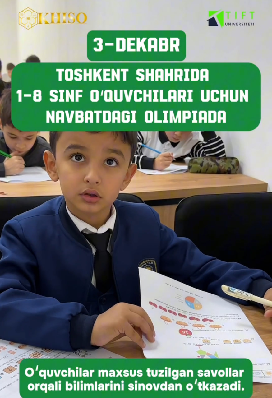 🧾Olimpiada dasturi bilan tanishing:Toshkent shahrida 1-8 sinf o‘quvchilari uchun o‘tkaziladi.🥇 Gʻoliblar 300.000 so‘m