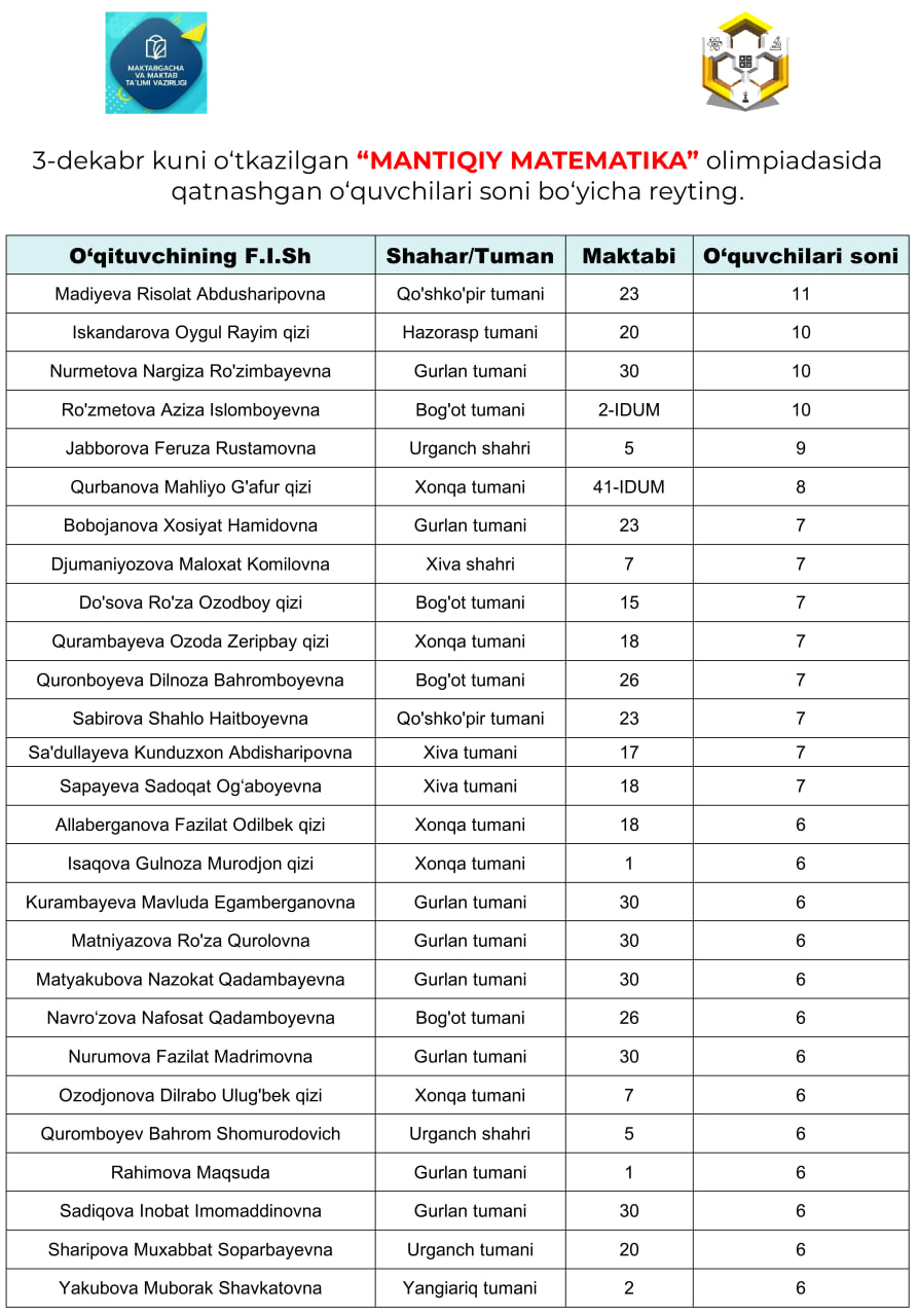 Quyidagi jadvalda 3-dekabr kuni o‘tkazilgan “MANTIQIY MATEMATIKA” olimpiadasida qatnashgan o‘quvchilari soni bo‘yicha re